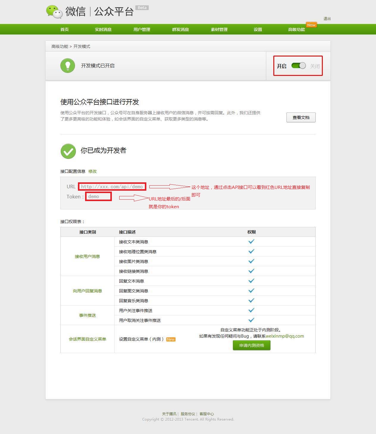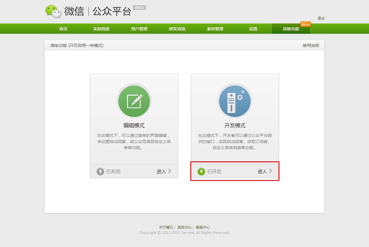 认证后,点击高级功能 → 进入开发模式