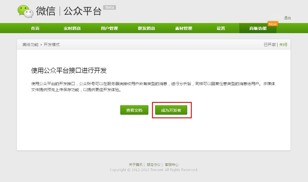2、点击"成为开发者"按钮